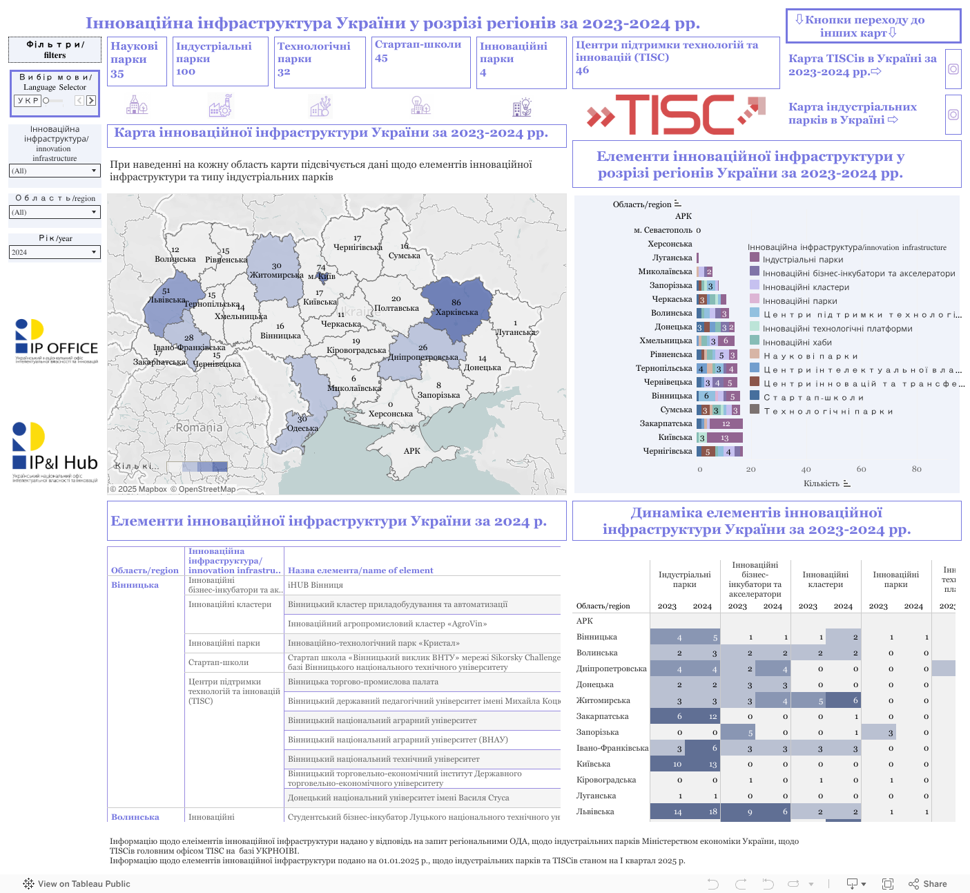 Український національний офіс інтелектуальної власності та інновацій (УКРНОІВІ / IP офіс) розробив новий дашборд інноваційної інфраструктури, а також інтерактивні карти індустріальних парків і центрів підтримки технологій та інновацій (TISC).