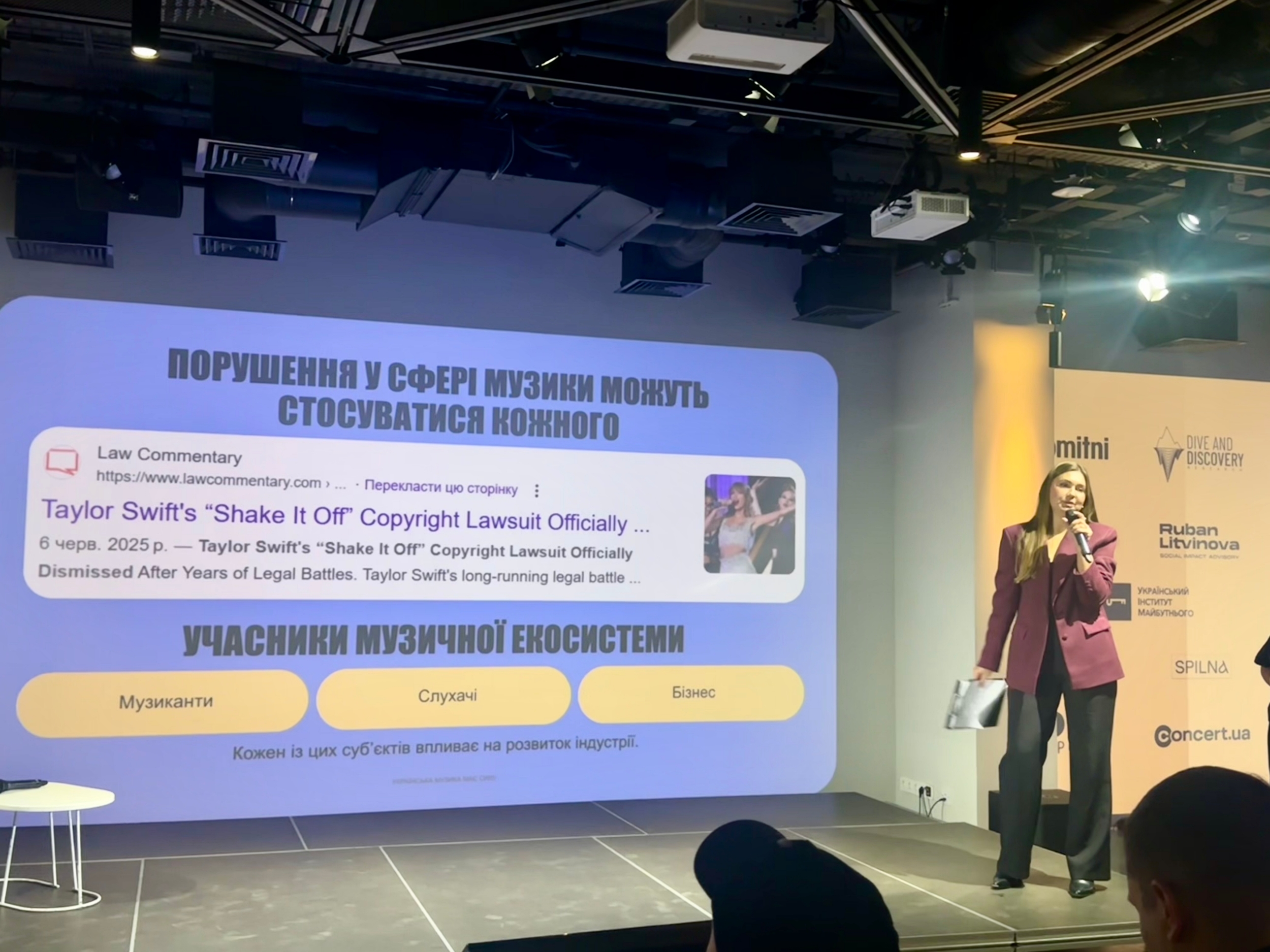 У своєму виступі вона розповіла про найпоширеніші моделі піратського споживання музики в Україні, поділившись результатами всеукраїнського опитування «Музика і право: обізнаність та поведінка слухачів в Україні». Окрему увагу спікерка приділила проблематиці несвідомого піратства серед слухачів, використанню музики бізнесом без дозволів, недостатній правовій обізнаності музикантів, а також питанням превентивного захисту – від реєстрації прав до укладення договорів.