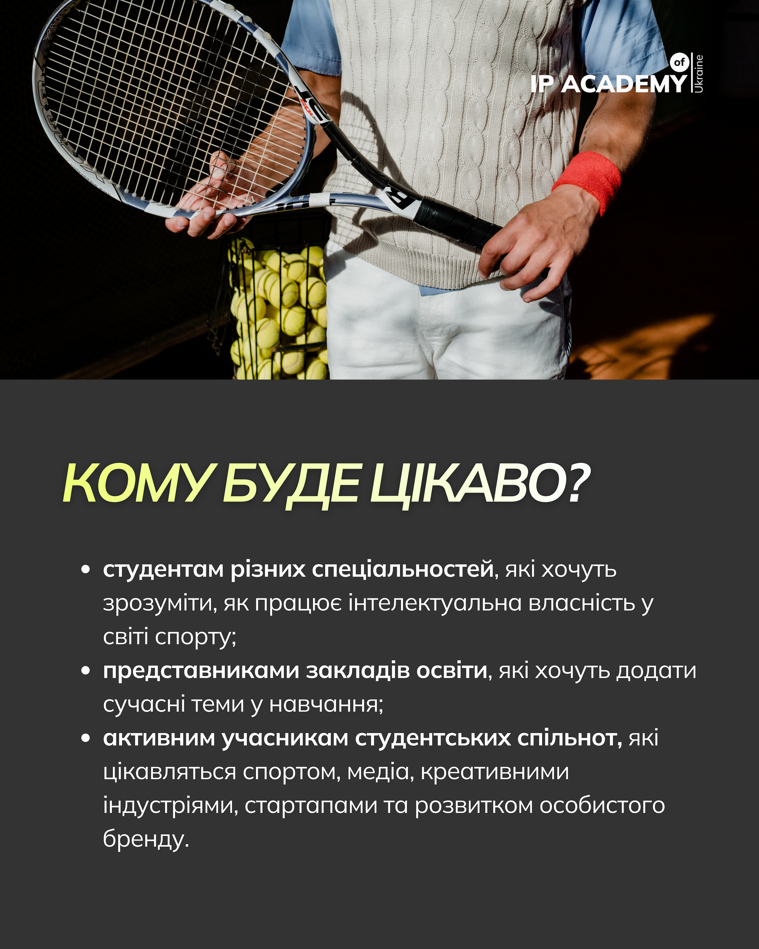 студентів різних спеціальностей, які хочуть зрозуміти, як працює інтелектуальна власність у світі спорту;