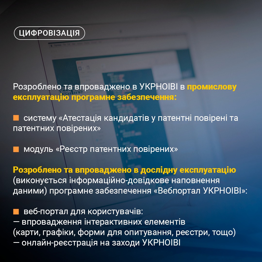 Так, протягом року розширювалася міжнародна співпраця, продовжувалася робота в межах євроінтеграційного процесу, удосконалювалося законодавство, впроваджувалися цифрові рішення та сервіси, посилювалася підтримка бізнесу, винахідників і креативних індустрій, розвивалася інноваційна інфраструктура, підвищувався рівень обізнаності щодо IP.