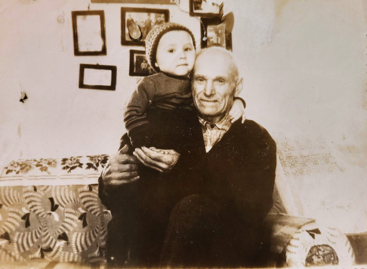 Сергій Андрющенко у дитинстві з прадідусем – Павлом Дементійовичем Павленком, учасником Першої світової війни, який пережив полон, повернувся до родини та заснував сімейну пасіку