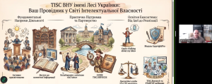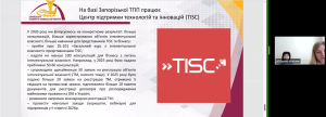 Анастасія Ярмолюк, начальниця відділу розвитку мережі центрів підтримки технологій та інновацій УКРНОІВІ, зосередила увагу на розвитку мережі TISC в Україні в контексті міжнародної співпраці з ВОІВ (WIPO), зокрема на доступних інструментах, освітніх програмах і можливостях для TISCs щодо підтримки інновацій та ефективного управління інтелектуальною власністю.