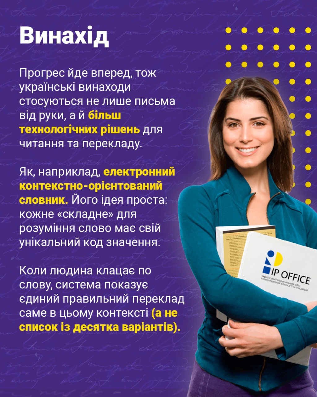 Та, звісно, прогрес йде вперед, тож українські винаходи стосуються не лише письма від руки, а й більш технологічних рішень для читання та перекладу. Як, наприклад, електронний контекстно-орієнтований словник.
