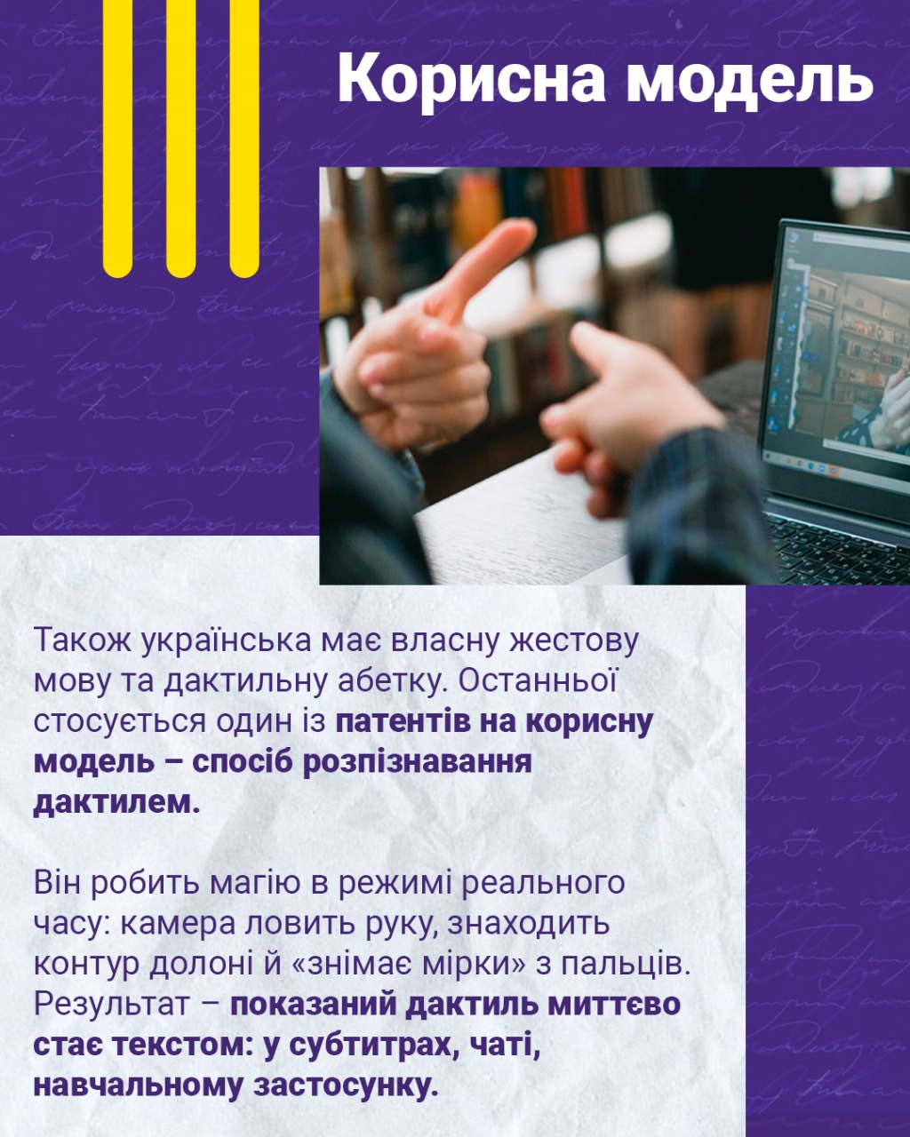 Також українська має власну жестову мову та дактильну абетку їй на допомогу. Власне, останньої стосується один із патентів на корисну модельспосіб розпізнавання дактилем. Він робить магію в режимі реального часу: камера ловить руку, знаходить контур долоні й “знімає мірки” з пальців. Далі все перетворюється на числа, і система крок за кроком відсіює зайве – поки не лишається одна-єдина літера. На фінал – контрольна звірка, щоб спрацьовувало навіть під іншим кутом чи при поганому світлі. Результат – показаний дактиль миттєво стає текстом: у субтитрах, чаті, навчальному застосунку. Менше бар’єрів, більше розуміння й доступності української жестової мови.
