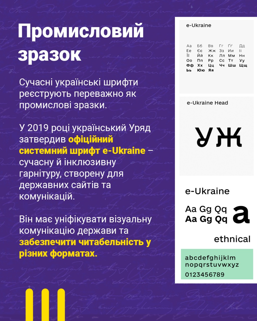 У 2019 році український Уряд затвердив офіційний системний шрифт e‑Ukraine – сучасну й інклюзивну гарнітуру, створену для державних сайтів та комунікацій. Він має уніфікувати візуальну комунікацію держави та забезпечити читабельність у різних форматах.