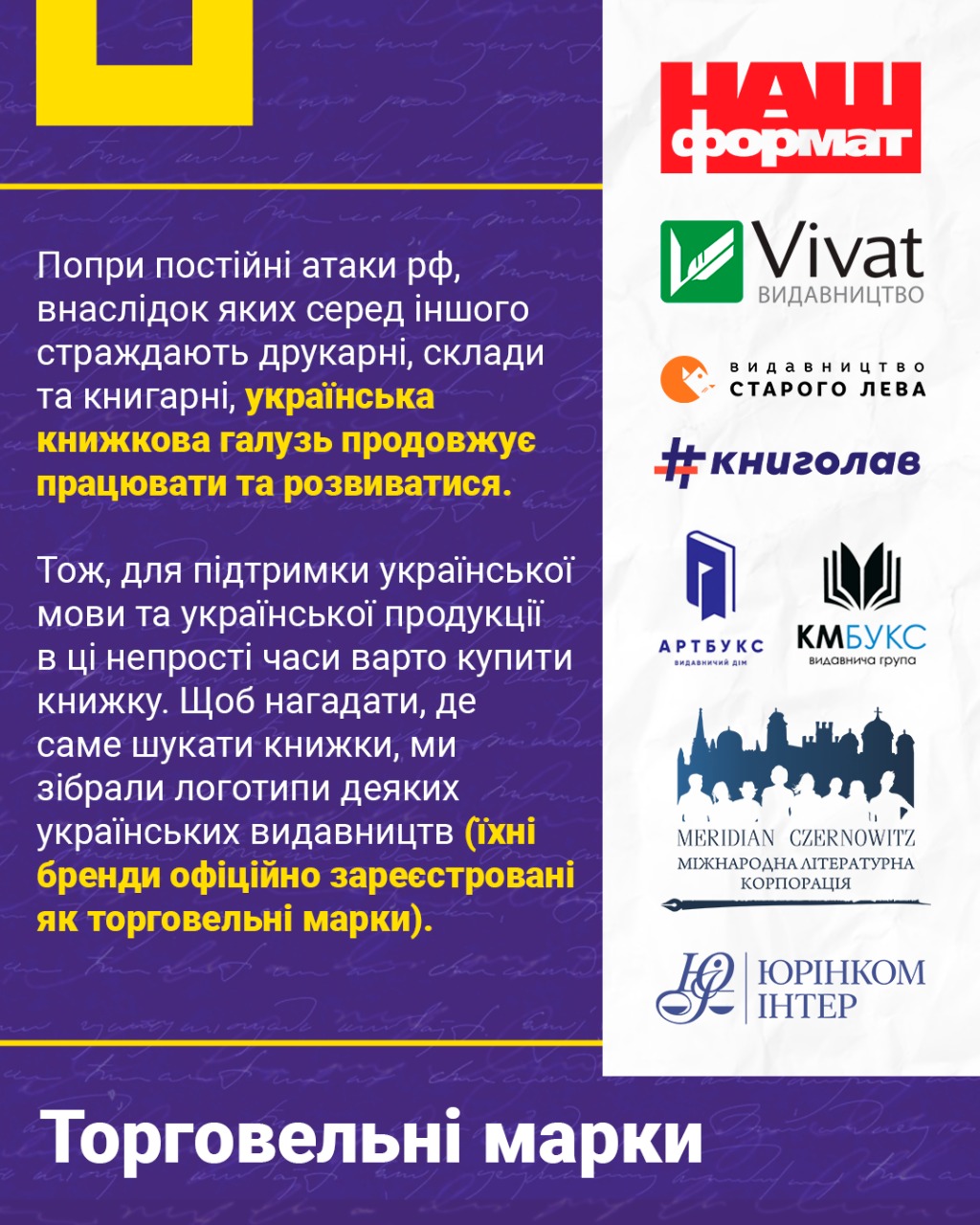 Тож, для підтримки української мови та української продукції в ці непрості часи варто купити книжку. Щоб нагадати, де саме шукати книжки, ми зібрали логотипи деяких українських видавництв (їхні бренди офіційно зареєстровані як торговельні марки):