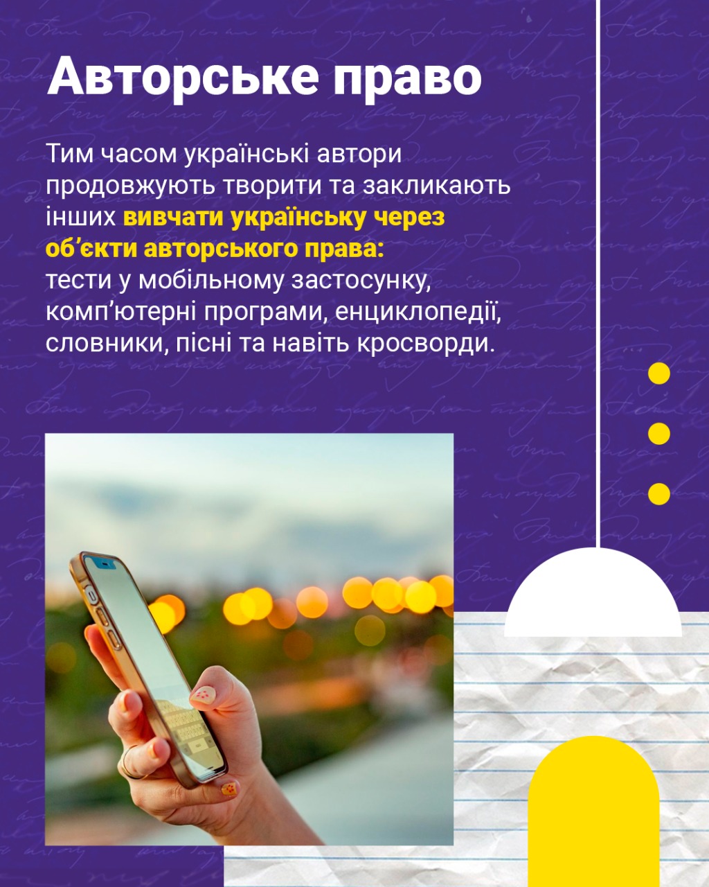 Тим часом українські автори продовжують творити та закликають інших вивчати українську через об’єкти авторського права: тести у мобільному застосунку, комп’ютерні програми, енциклопедії, словники, пісні та навіть кросворди.